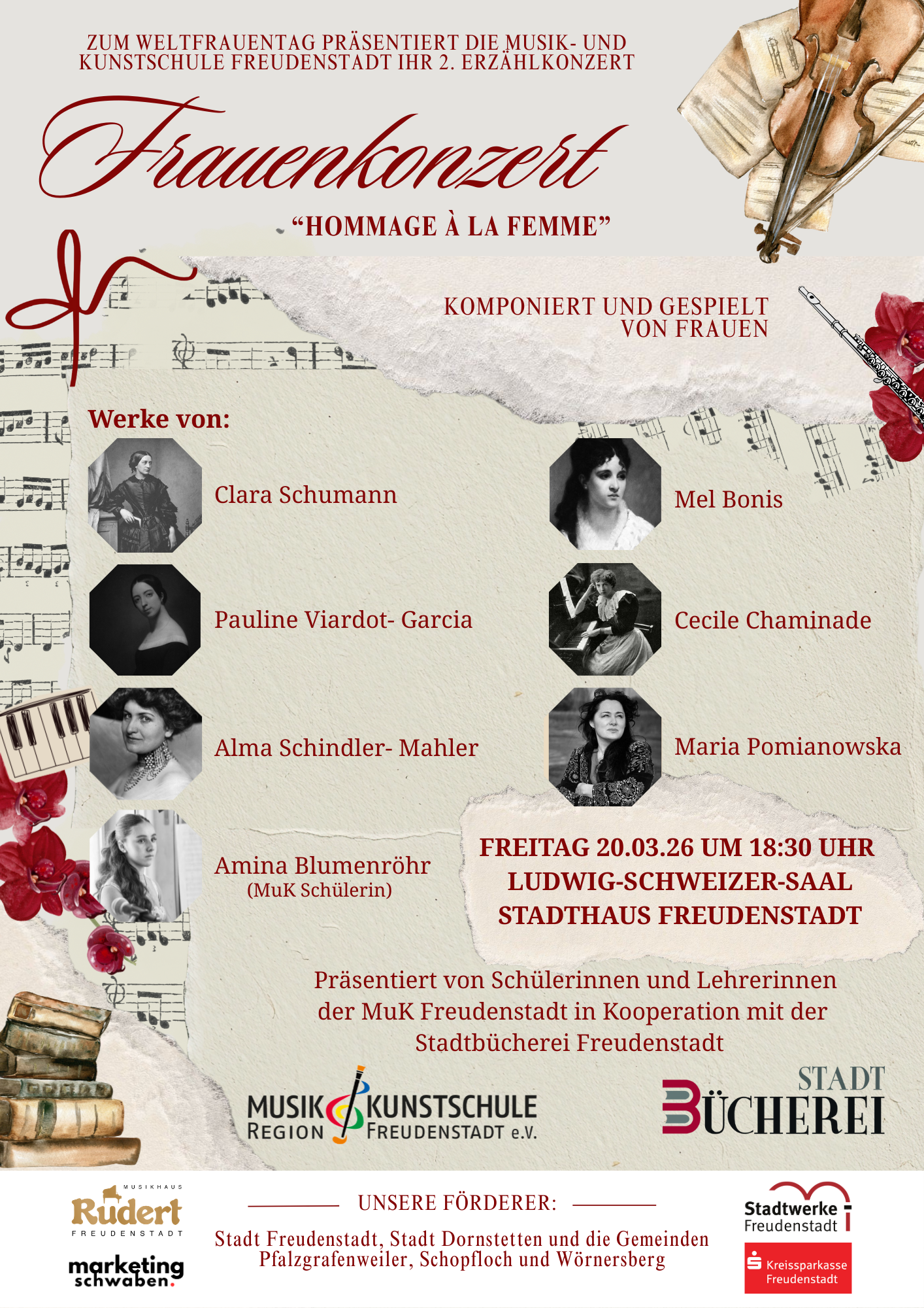 Zum Weltfrauentag präsentiert die Musik- und Kunstschule Freudenstadt ihr 2. Erzählkonzert. Komponiert und gespielt von Frauen.